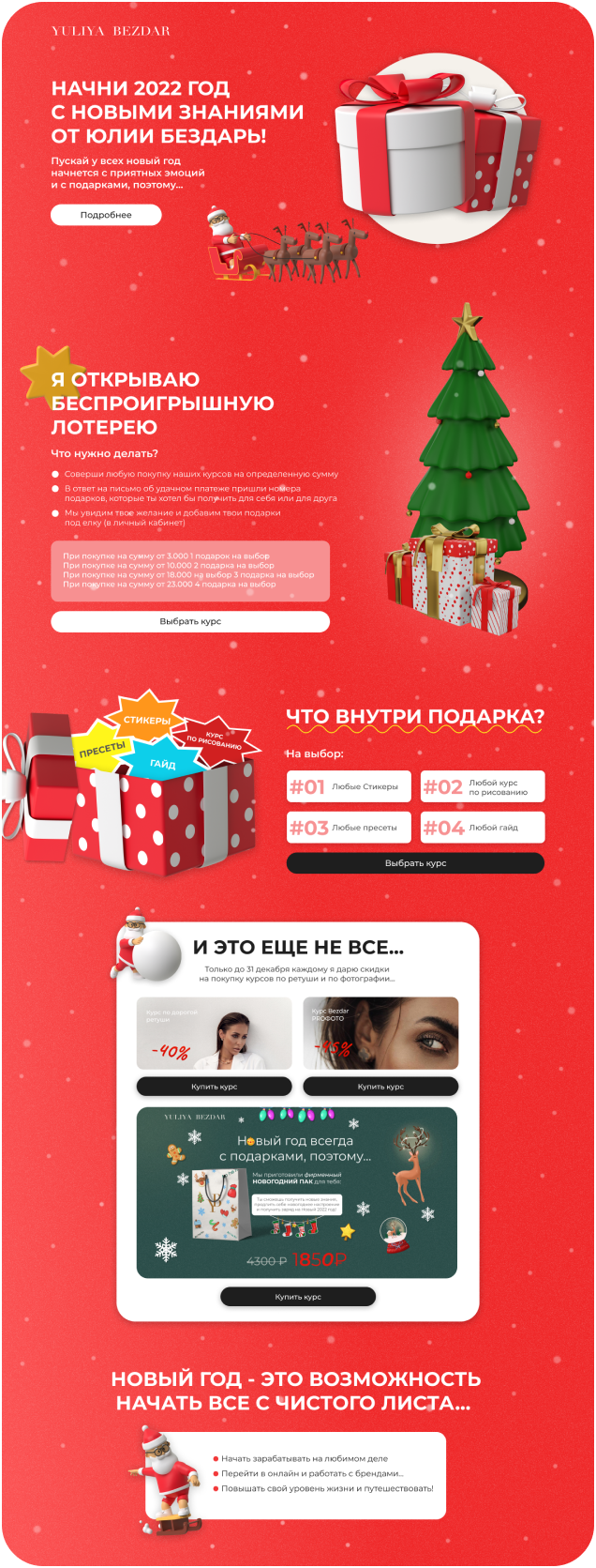 Задачей проекта была создать лендинг на Tilda для новогодней распродажи онлайн курсов. Дополнительным пожеланием от заказчика было реализовать сложную анимацию на странице.